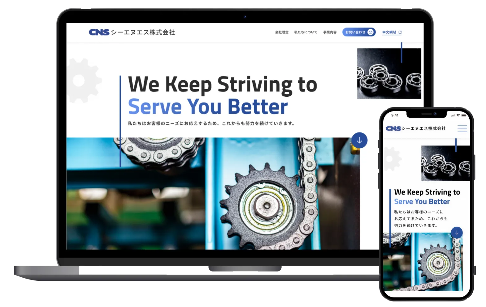 シーエヌエス株式会社様のサイト制作を行いました。1ページ完結型のサイトで、事業内容や会社概要が伝わりやすいデザインを意識しました。